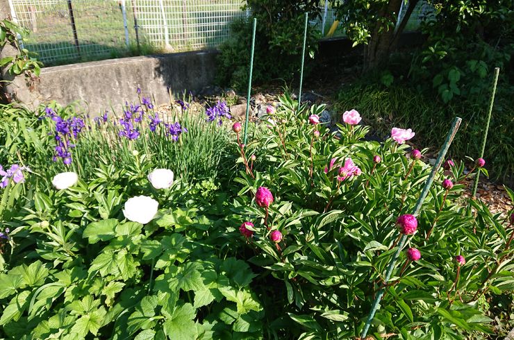 2022/05/055月5日 例年通り、芍薬が咲き始めました。 庭には8種類植えてありますが、どれも蕾が上がってきて赤、白、ピンクの花を披露してくれます。 場所的に風当たりが良く、茎が花の重さに耐えられず、折れてしまいますので、囲ってやりました。 これできれいに咲いてくれると思います。 -