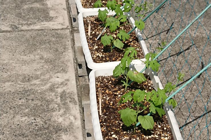 2022/06/026月2日 今年も真夏の暑さをしのぐために「ゴーヤのグリーンカーテン」を準備しました。 いつまでも寒さがありましたので、昨年より1週間程遅れました。 昨年は一つのプランターに3株植えましたが、入れ過ぎだったのか?成長が悪かったので、今年は2株に減らしました。 どのように成長してくれるのか楽しみにしております。 -